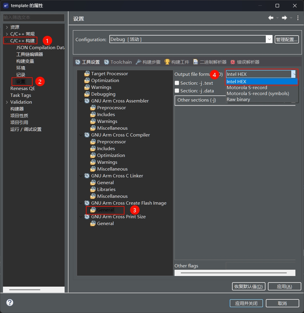 为了方便之后下载hex文件,需要在项目设置中设置输出文件为HEX。 点击菜单栏的 项目--属性,然后如下图所示配置