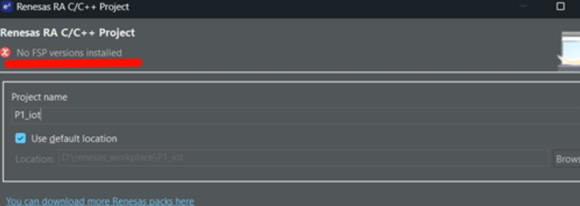 错误提示:有可能你在创建工程时会遇到 No FSP versions installed错误,出现在如下图所示的位置。