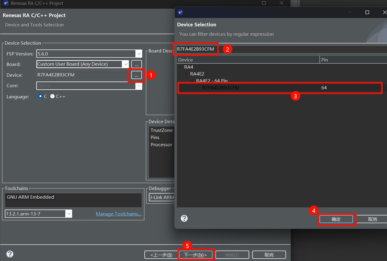 接下来选择芯片,按下图步骤来,本次开发板所用的芯片型号为R7FA4E2B93CFM