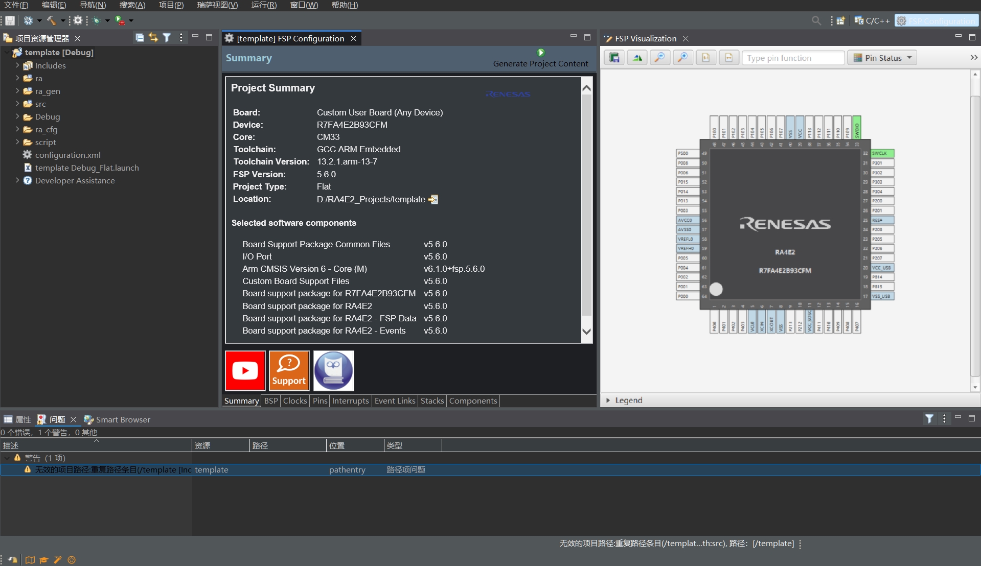点击上一步主界面的Generate Project Content,等待进度条走完。 打开src下的hal_entry.c,点击左上角的小锤子进行build工作,完成之后应在控制台看到0 errors, 0 warnings