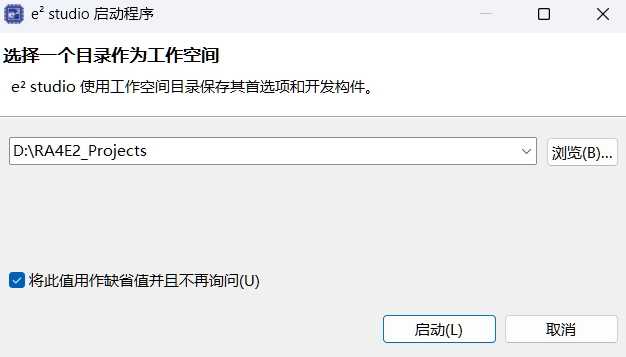 启动e2s,在打开的对话框中配置你的工作路径,注意不要使用中文。我这里创建了个名为RA4E2_Projects的文件夹来存放项目。