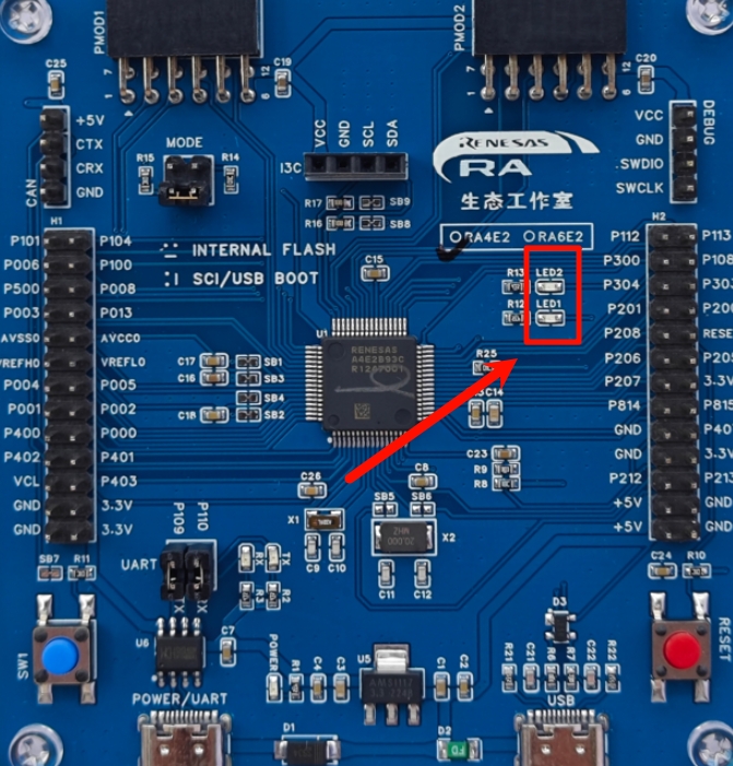 通过查阅开发板原理图得知,这款RA-Eco-RA4E2-64PIN-V1.0开发板上载有两个LED灯,在板子实物的位置如下图所示: